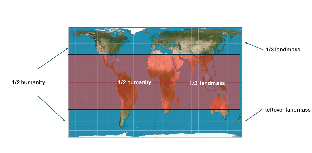 Right now we can estimate that my Middle Earth zone encompasses a bit more than half of the world’s population — as well as just over half of the world’s non-Antarctic landmass, with the high latitudes north and south currently accommodating the other near-half of the world’s population.