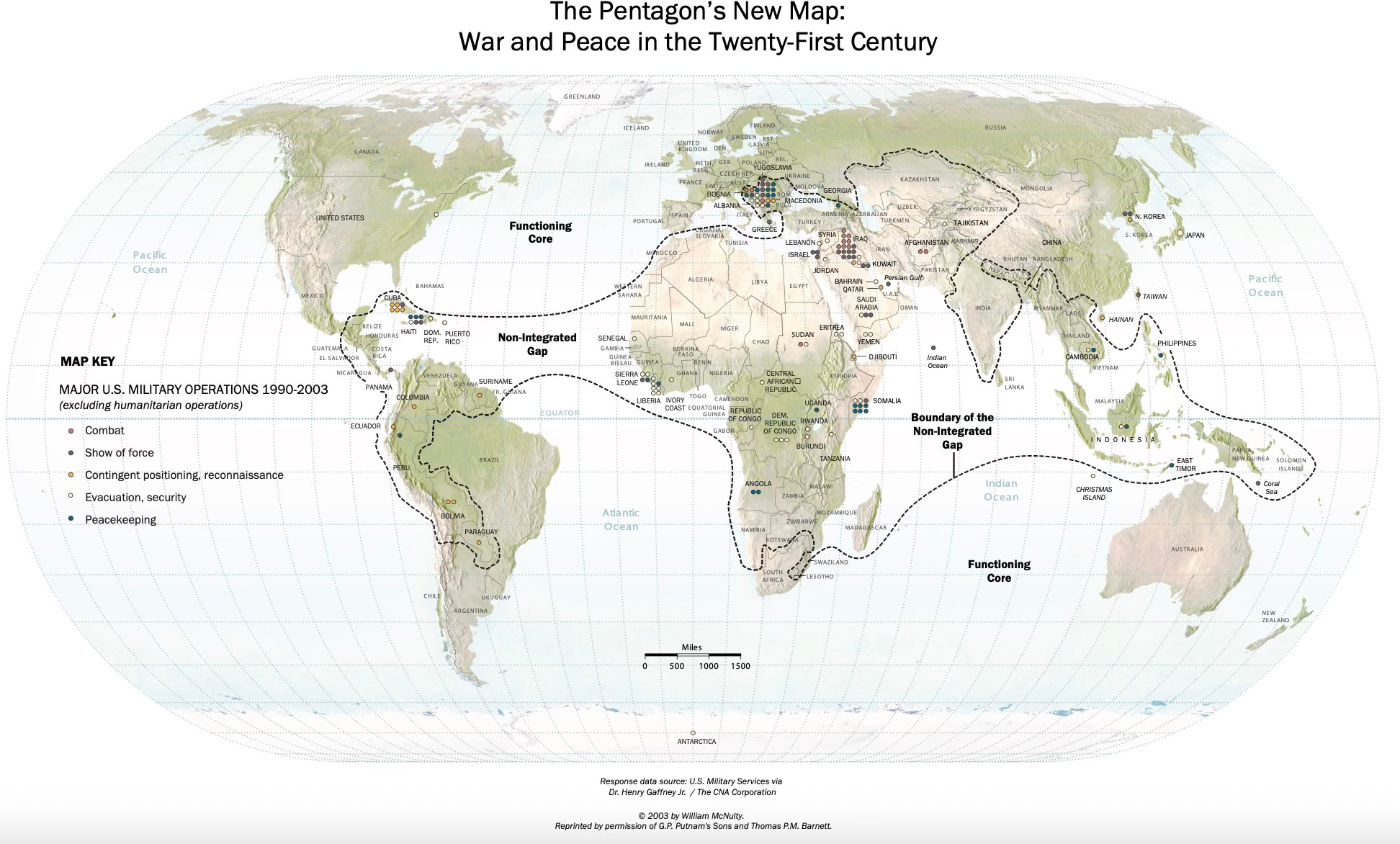 In The Pentagon’s New Map, I wanted to show you how far globalization’s deep connectivity extended around the world to make clear that, where it had not taken deep root, we could locate the vast majority of the world’s organized and disorganized violence. Yes, a quartet of Cold War “tailbones” are out there still (Russia-v-former Soviet Republics, ROK-v-DPRK, China-Taiwan, Israel-Palestine) — all of which run hot and cold over the decades), but, if you mapped where US military forces were sent in the post-Cold War era, the demand signal was awfully clear — as in, equatorially centric.