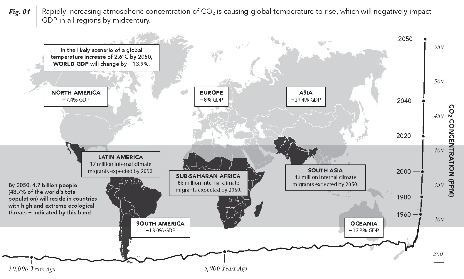Through Diamond’s analysis, we understand the power of one geographically expressed axis (East-West) over another (North-South). Once we accept that, we can imagine that power relationship being reversed through superior environmental forces. If previous, imperial iterations of globalization were fundamentally predetermined by our planet’s environmental makeup, then we can posit that US-style globalization, having so reshaped Earth’s environment as to earn its own geologic era, now determines humanity’s future path.