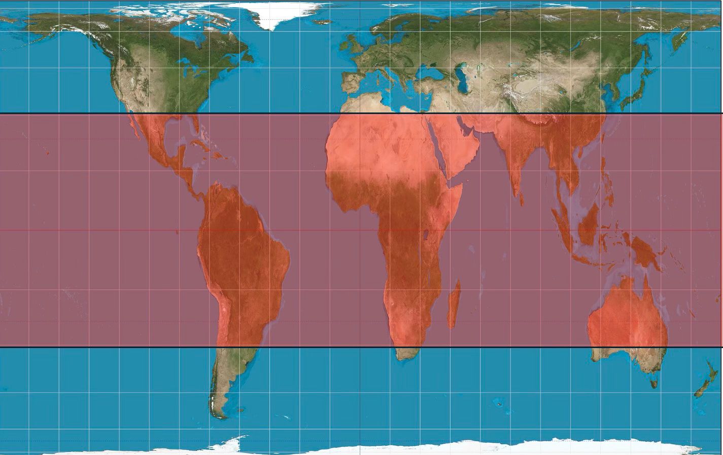 Now, take a look at a Gall-Peters projection with my Middle Earth (30 degrees north and south of the equator) marked out and I think you’ll have a different sense of how widely climate change is going to devastate the world’s continental landmasses — in effect, ruining a very large percentage of Earth’s land surface and forcing a lot of migration toward a Global North that we’ve historically thought is a lot larger than it really is, relative to that Global South about to be remapped by climate change.