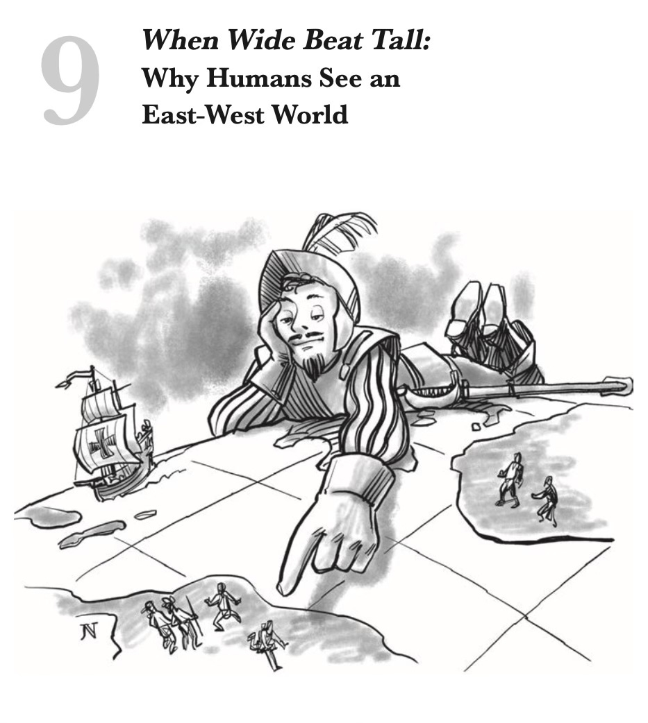 Then there are our cognitive maps, or the way our minds organize and remember spaces once explored. For the longest time, our forebearers came (or were forcibly brought) here from continents to the east. Having landed on our East Coast, they settled ever westward as our nation expanded. To us, the East is old, yesterday, and crowded, while the West is forever new, tomorrow, and limitless. We apply no such distinctions to North or South—just colder or warmer.