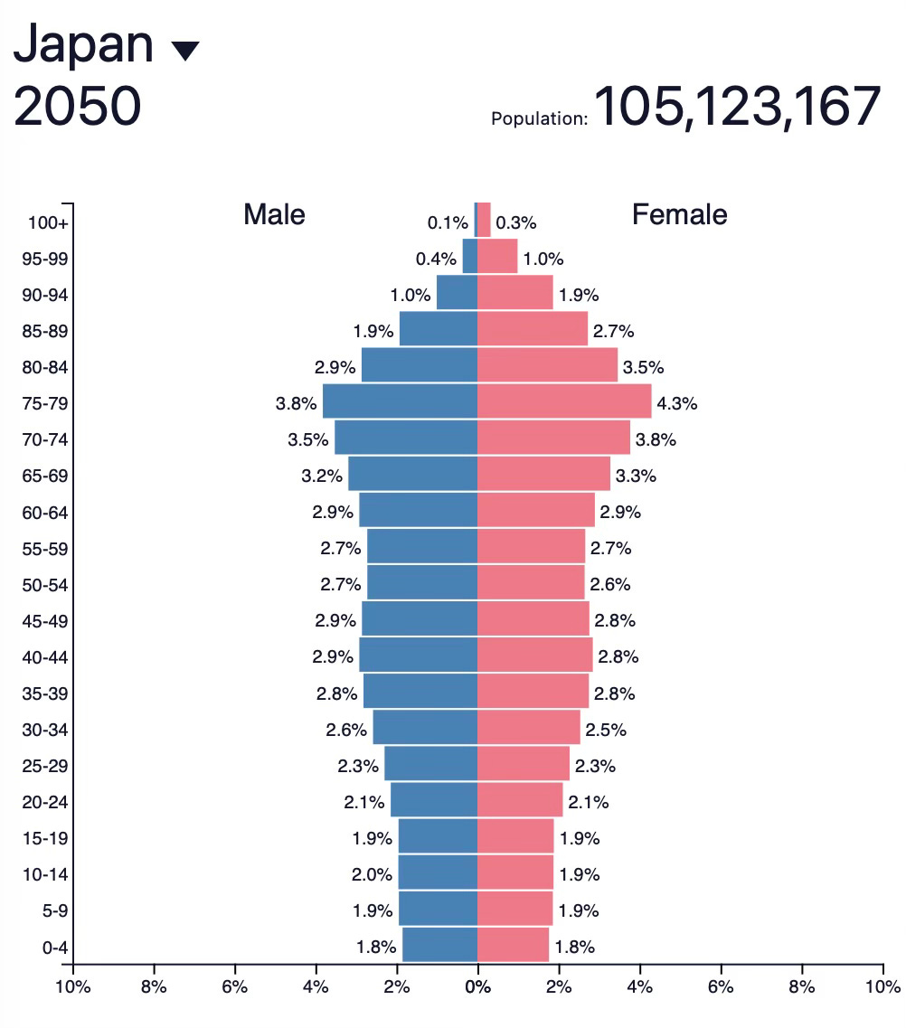 Japan, for example, will see its demographic center of gravity resting at the 75-80 age bracket come 2050, having lost one quarter of its population (105m—>77m) along the way.