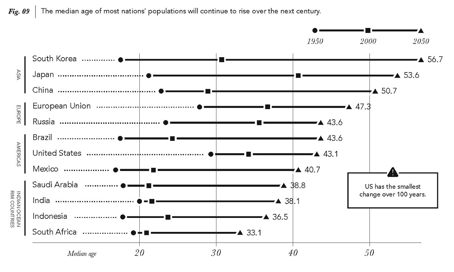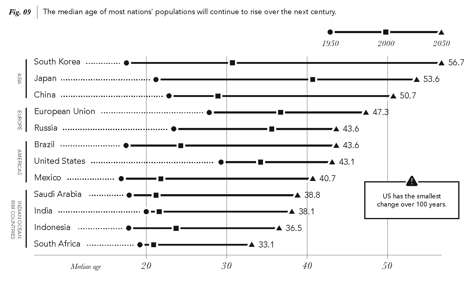 As US demographers Richard Jackson and Neil Howe have noted, aged societies favor “consumption over investment, the past over the future, and the old over the young.” [Sound familiar, America?] History shows that diminishing demographic strength leads to lower economic growth and a risk-averse society where an elder-dominated electorate resists emerging priorities for public spending. There is a reason Fox News’s audience skews so elderly and so many of our political leaders are twice as old (mid-seventies) as our nation’s median age (thirty-eight). Fortune favors the bold—not the old.